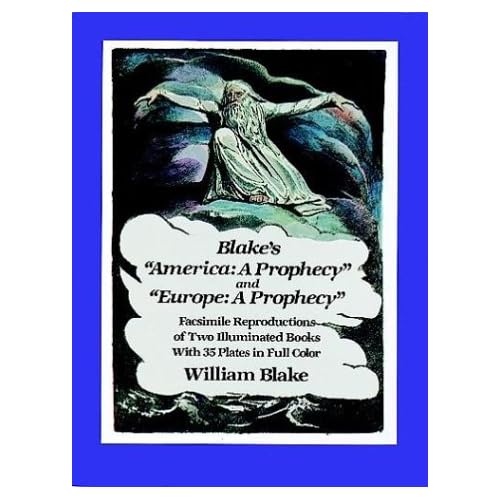 William Blake's prophetic poems, "America" and "Europe" were both written almost twenty years after the American Revolution began, and about five years or so after the start of the French Revolution in the late 1700's. Both poems exhibit Blake's intense engagement with the socio-political atmosphere of his time. Both address contemporary figures: King George III of England, George Washington, Benjamin Franklin, and so on. Over this layer of response to history, Blake mythologizes the spirits of the age with his own pantheon of fantastic, complicated personalities, like Orc, the fiery spirit of revolution, and his primary opponent, Urizen, the spirit of rationality, order, and law."America" deals with the American Revolution in retrospect, and meanwhile Blake is thinking about recent developments in France in the early 1790's. Blake questions the persistence of African slavery, both in America and in the British slave trade (note the reference to Bristol towards the end). He also looks critically at the pervasive and often perverted influence in the British Empire of law, both religious and political. "Europe" looks at the after effects of the American Revolution, and how the spirit of rebellion, spreading already in "America" to Ireland and Scotland, advances through Europe, especially to France. "Europe" tries to explain the history of conflict in the world since the time of Christ. "Europe" is much more abstracted from human history than "America," depending more on the conflicts between Blake's mythical personages.This edition of "America" and "Europe" published by Dover is of a decent quality. The prints of Blake's illustrations are in full color, and page-sized to allow for close perusal of his intricate designs. The copies of the poems seem to have been chosen for the least background color contrast, making Blake's script readable. However, there are more brilliantly colored versions of both than we get in this edition. The poems themselves are included in plain text following the illustrated versions. Each poem is prefixed by a moderately helpful explanation, though too simplistic in both cases - many of the plate descriptions do not even mention all the figures or objects in each plate, which can detract from the fullest enjoyment of the Blake novice. On the whole, the poetry will always be phenomenal - however, in this Dover edition, the presentation leaves something to be desired.