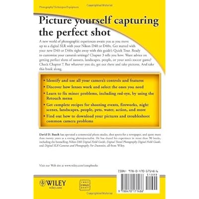 From the Back Cover Picture yourself capturing the perfect shot A new world of photographic experiences awaits you as you move up to a digital SLR with your Nikon D40 or D40x. Get started with your new D40 or D40x right away with this guide's Quick Tour. Ready to customize your camera's settings? Chapter 3 tells you how. Want advice on getting perfect shots of sunsets, landscapes, people, or your son's soccer game? Check Chapter 7. But whatever you do, get out there and take pictures. And take this book along. Identify and use all your camera's controls and features Discover how lenses work and select the ones you need Learn to fix minor problems, including red-eye, by using the Retouch menu Get complete recipes for shooting events, fireworks, night scenes, landscapes, people, pets, water, action, and more Find out how to download your pictures and troubleshoot common camera problems Read more About the Author David D. Busch has operated a commercial photo studio, shot sports for a newspaper, and spent more than twenty years as a roving photojournalist. He has shared his experience in more than 90 books, including the bestselling Nikon D80 Digital Field Guide, Digital Travel Photography Digital Field Guide, and Digital SLR Cameras and Photography For Dummies, all from Wiley. Read more
